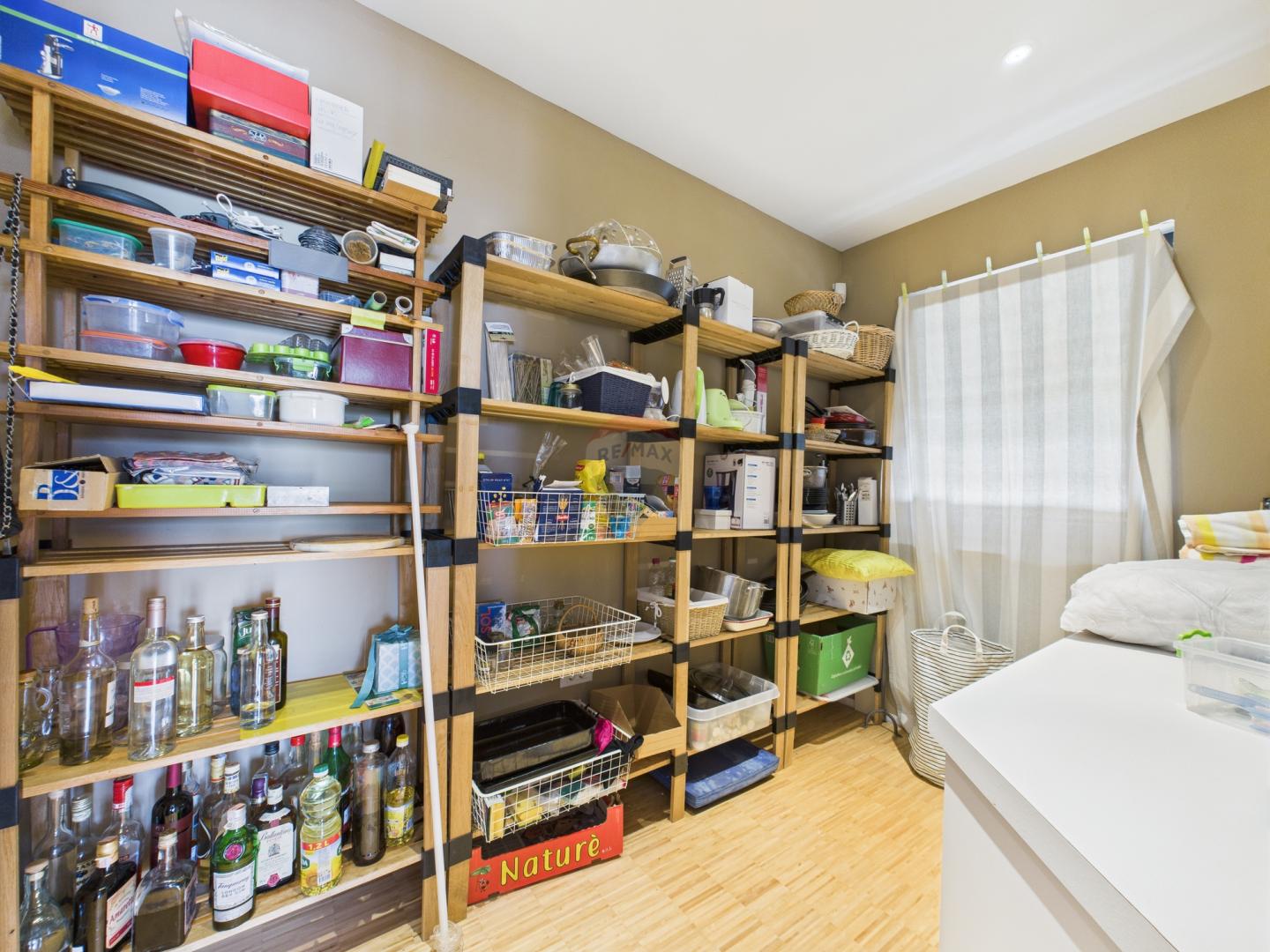 L'ampio seminterrato di 184,5 m² ospita un garage per 4 auto, un locale caldaia, un corridoio, 3 ripostigli e una scala. Il piano terra è un unico grande appartamento di 176,38 m² totali con una terrazza esterna coperta dalla quale si accede alla piscina di forma irregolare di 50 m² e a un giardino splendidamente curato.