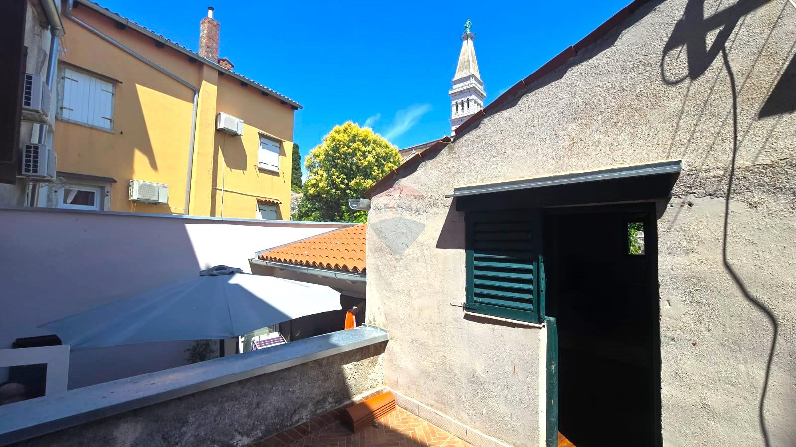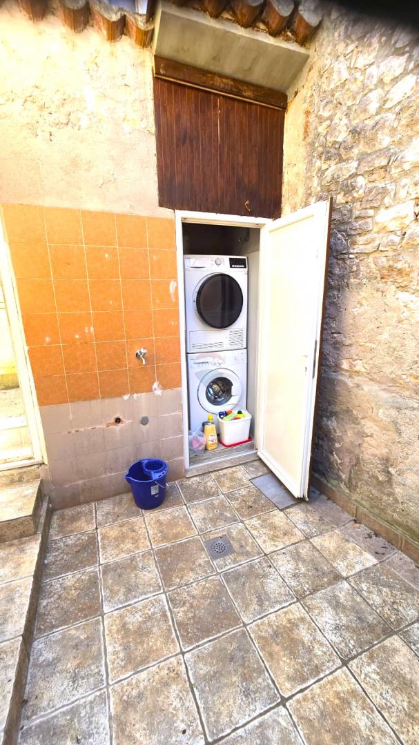 Ispred kuće nalazi se ograđeno dvorište od 8m2 i spremište u kojemu se nalazi mini praonica-perilica rublja i sušilica,
