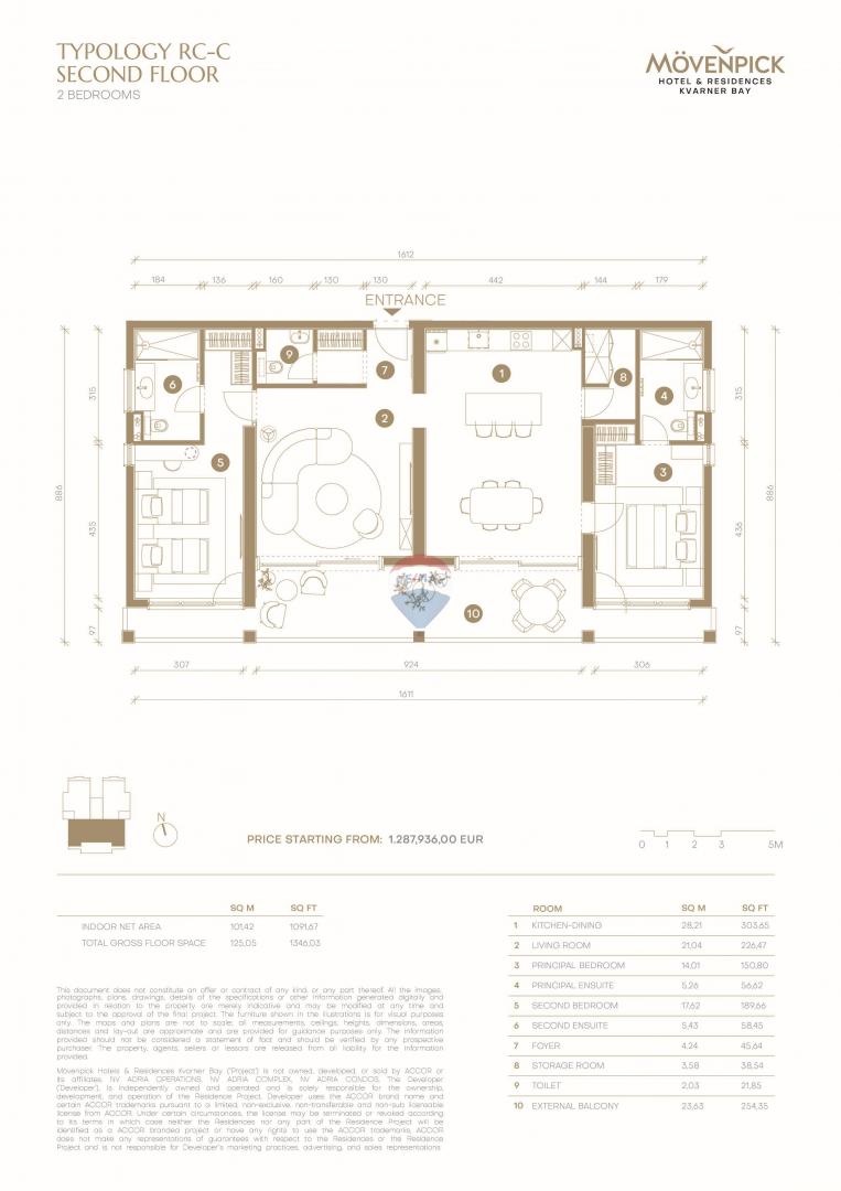 Sastoji se od kuhinje s blagovaonicom, prostrane dnevne sobe dvije spavaće sobe, dvije kupaonice, wc, spremište i ulaznog prostora. Velike staklene stijene od poda do stropa unose obilje prirodnog svjetla i povezuju interijer s prostranom terasom od 24m2 stvarajući prirodan nastavak životnog prostora na otvorenom.